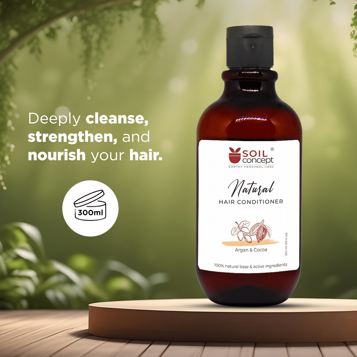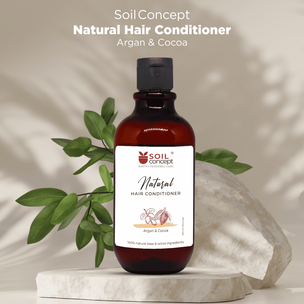 Indulge your hair with SoilConcept Natural Hair Conditioner, featuring the nourishing properties of argan oil and cocoa. Argan oil, rich in essential fatty acids and vitamin E, deeply conditions and repairs, leaving hair silky smooth and frizz-free. Cocoa, known for its antioxidant properties, revitalizes and strengthens hair, enhancing shine and elasticity. Ideal for all hair types, this conditioner delivers intense hydration and nourishment without harsh chemicals. Experience the luxurious blend of argan and cocoa for naturally beautiful, healthy hair with SoilConcept.